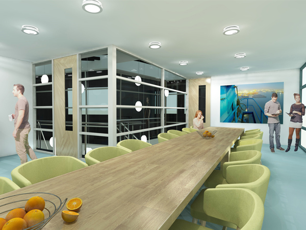 Op de begane grond met balie en wachtruimte. Op de verdieping vide met rondom glas naar de kantoren en kantine.
