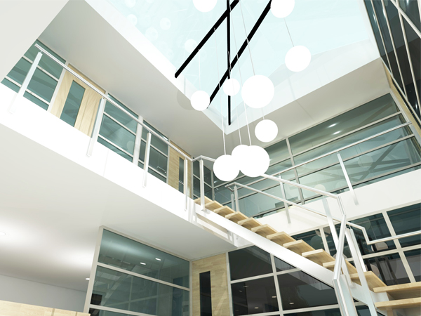 Op de begane grond met balie en wachtruimte. Op de verdieping vide met rondom glas naar de kantoren en kantine.
