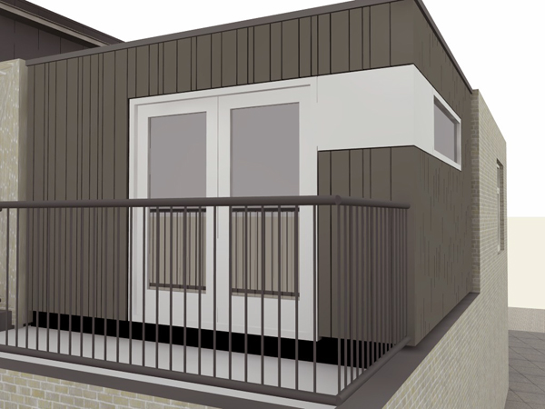 Uitbreiding woning met extra kamer op 1e verdieping. Houtskeletbouw met houten kozijnen. Redceder gevelbekleding. Ontwerp en realisatie 2013 Studio Hans Huitinck
